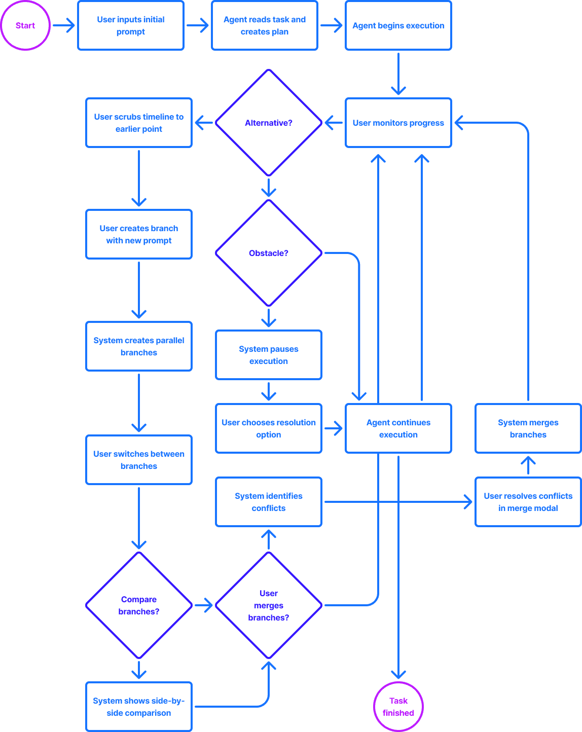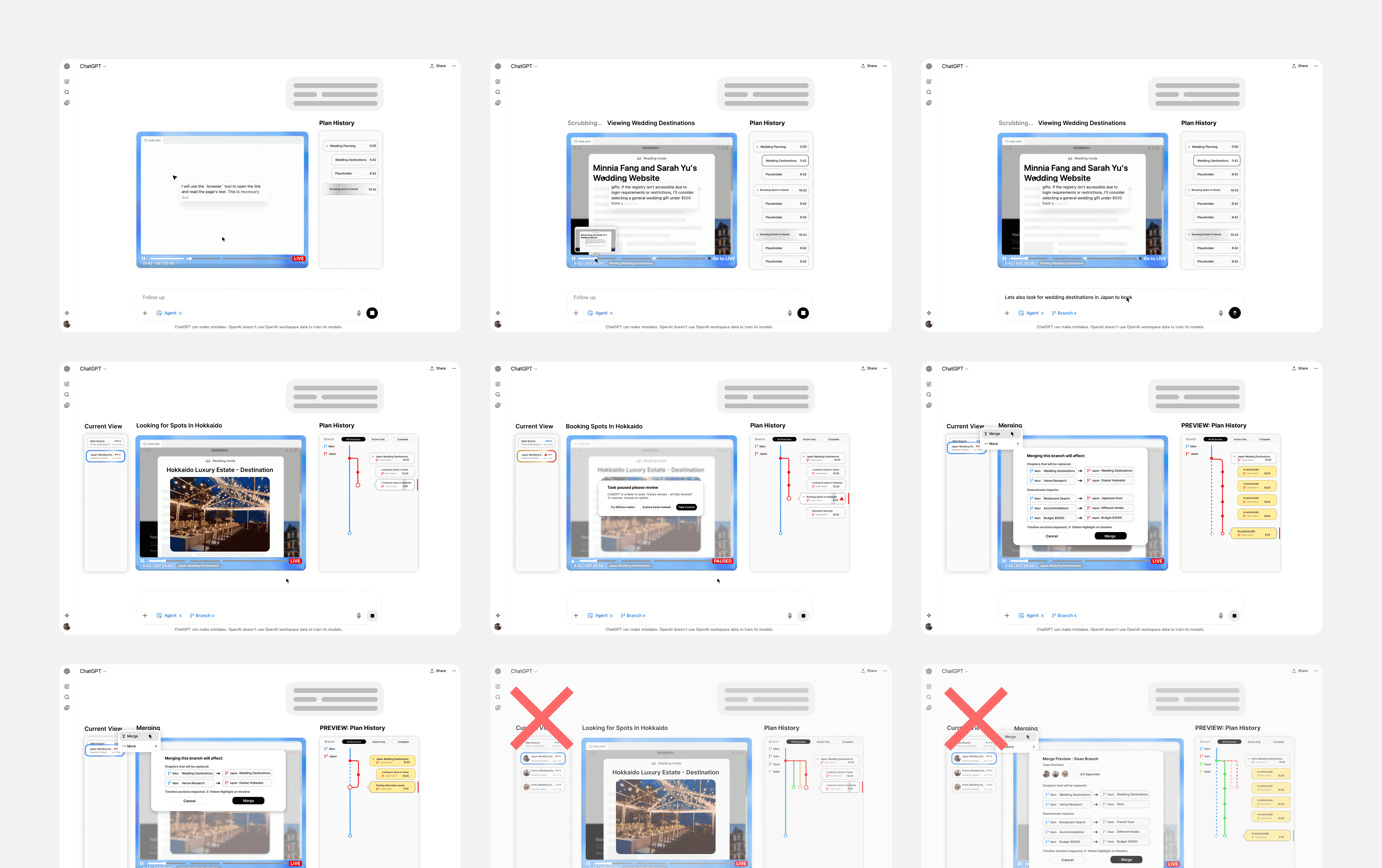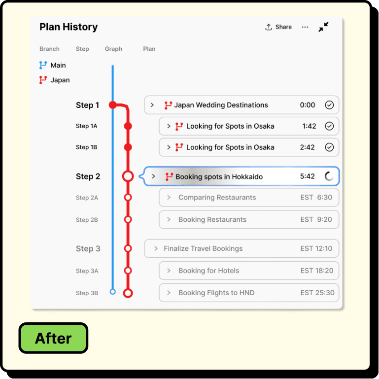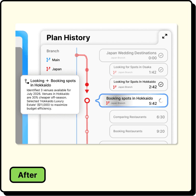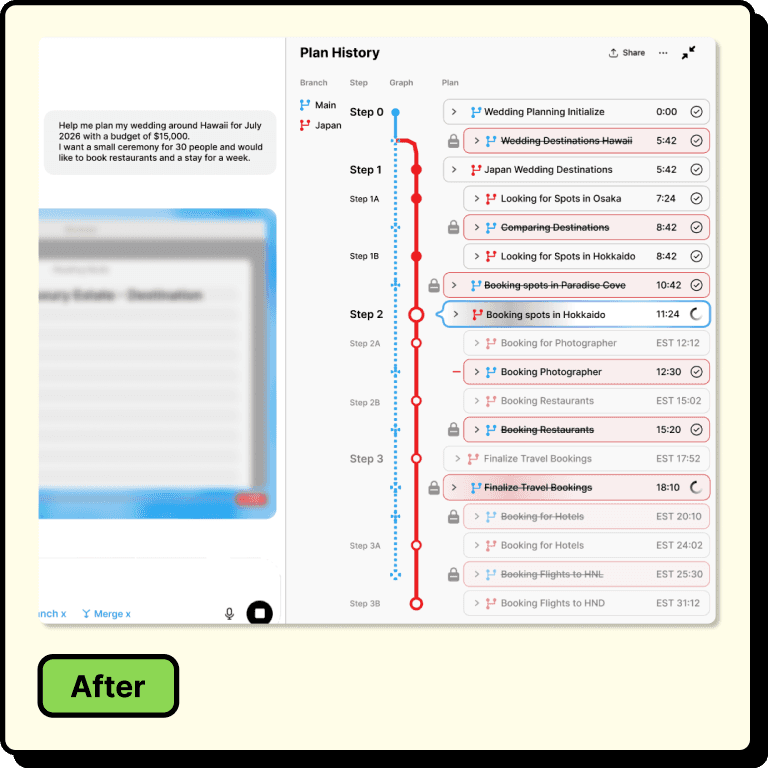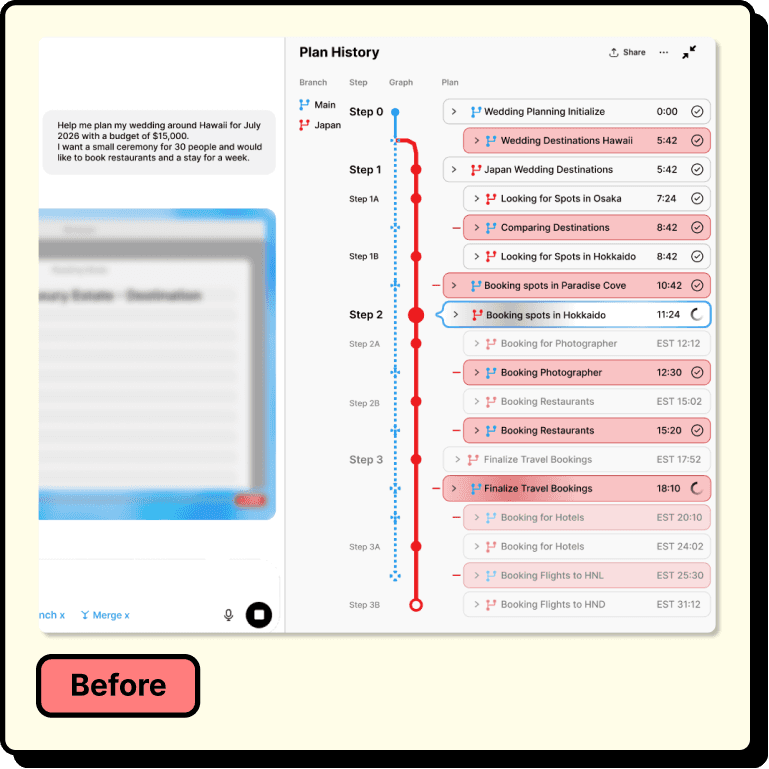 Users prompt the agent, and it decomposes the task into chapters. During execution, they monitor progress through a live view and a plan history panel. If they step away, they scrub back through the timeline to catch up. Clicking edges between steps reveals the agent's reasoning. From any past node, users can branch into an alternative direction without losing the original path, then merge the best results back into a single, unified plan.