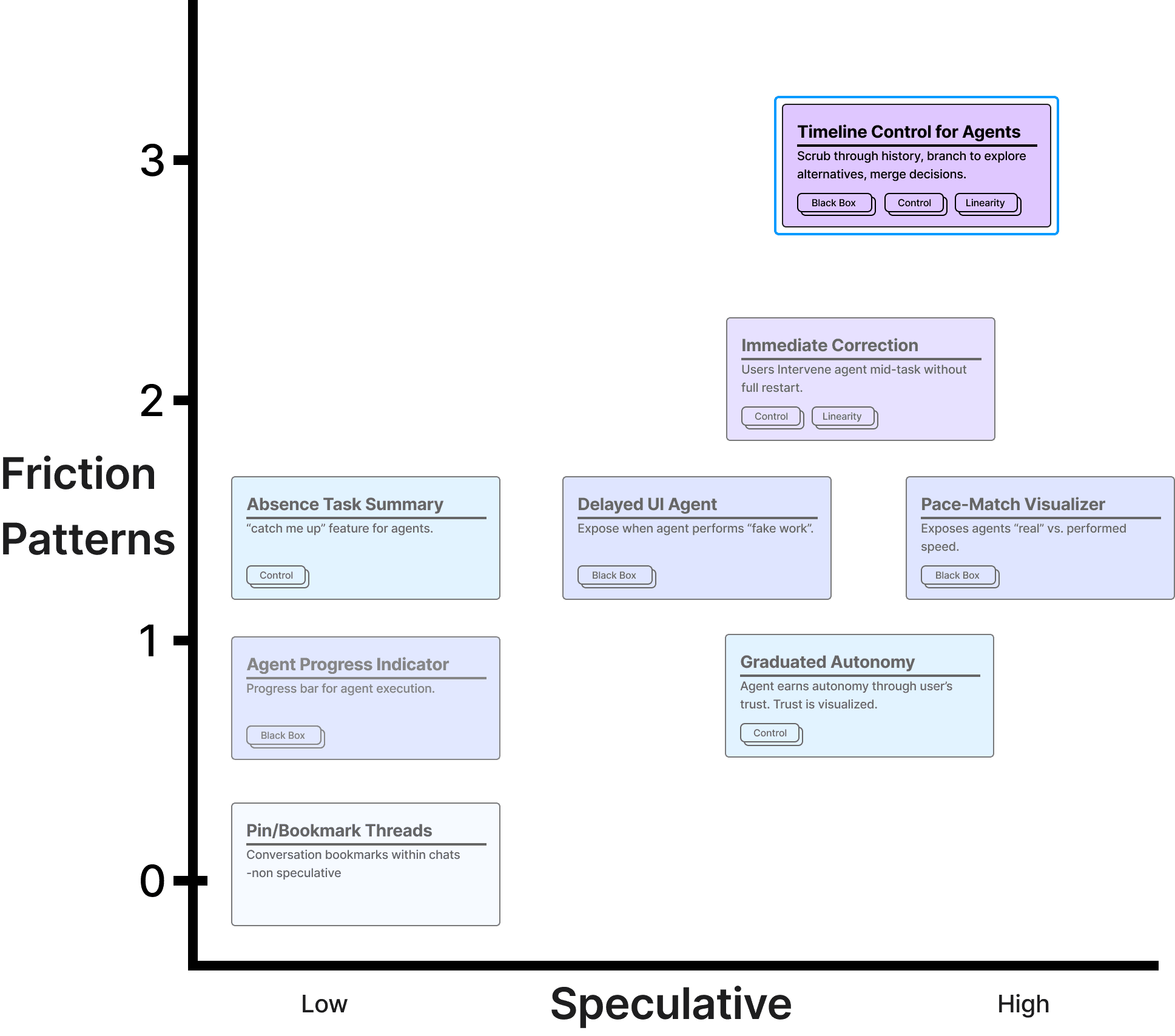 With the three friction patterns defined, I brainstormed potential solutions and graphed them by how many patterns they addressed and how novel their approach was. After mapping out possible solutions, Timeline Control for Agents emerged as the clear solution to address the entire problem space.