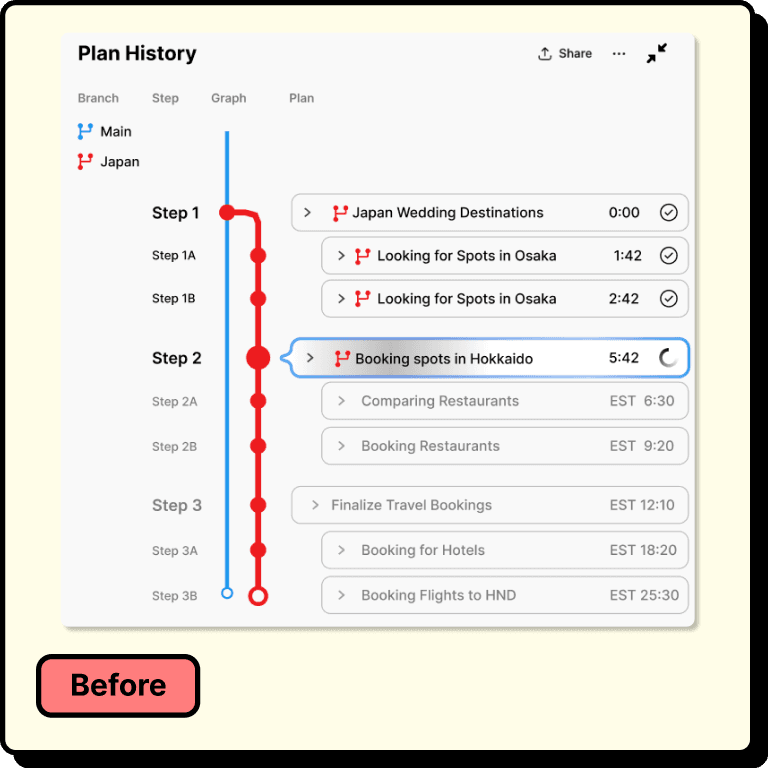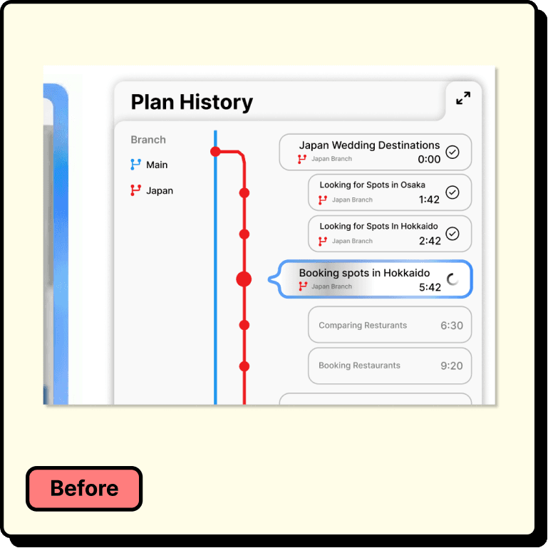 I conducted usability tests and reviewed the mid-fi prototype with my research leads. Three notable issues emerged: the plan history showed steps but not the agent’s reasoning behind them, the merge interface was visually overwhelming, and branch nodes gave no indication of completion state. Each problem identified usability gaps in clarity and feedback that needed to be addressed before moving to high fidelity.