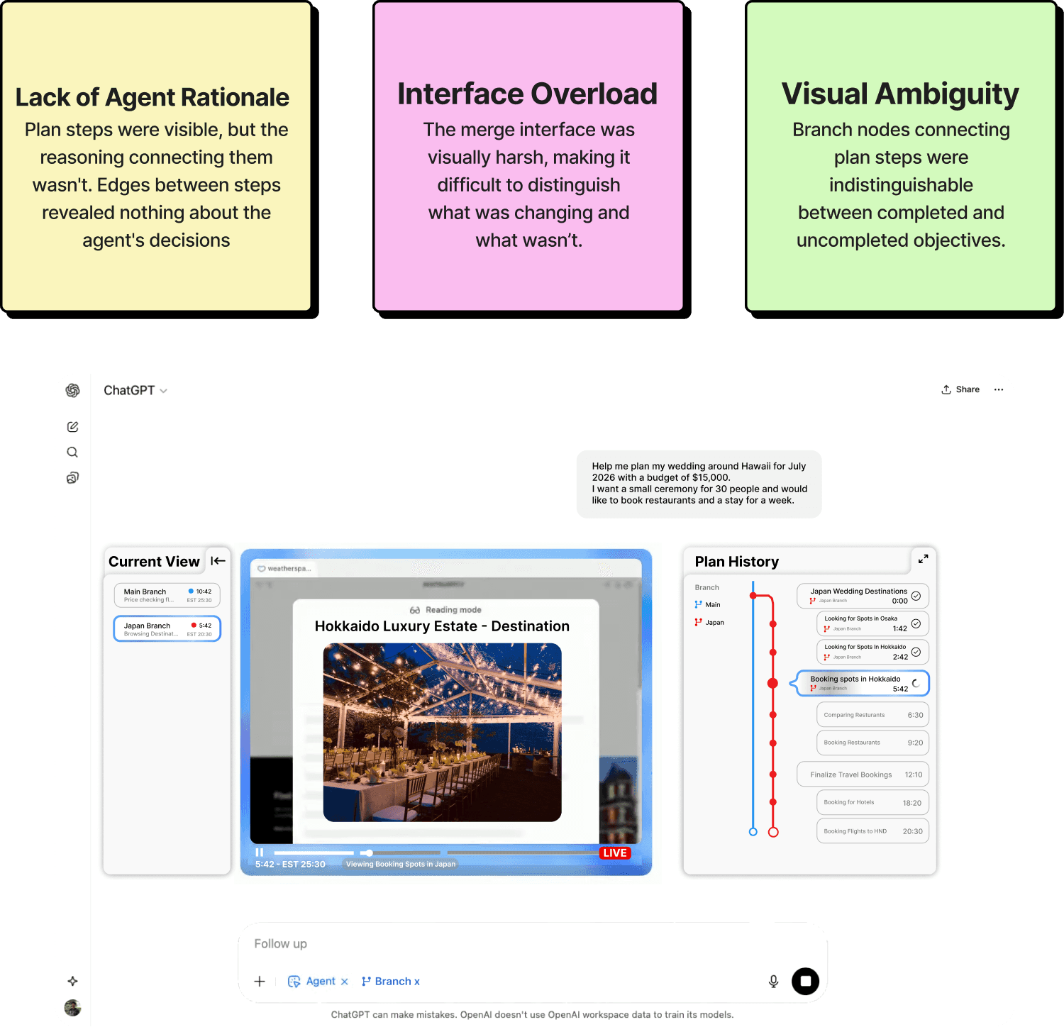 After synthesizing modern agents, conducting literature analysis, and engaging in research discussions, I identified three interconnected friction patterns. Two stem directly from Microsoft HAI guidelines, G11 and G9. The third emerged from observing tools like ChatGPT Deep Research, which lock users into a single execution path. No way to branch or backtrack without losing all progress. It was my role to discover a new interaction paradigm to address these gaps.