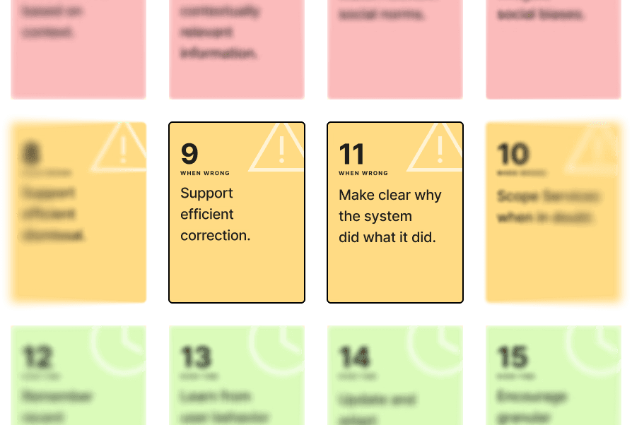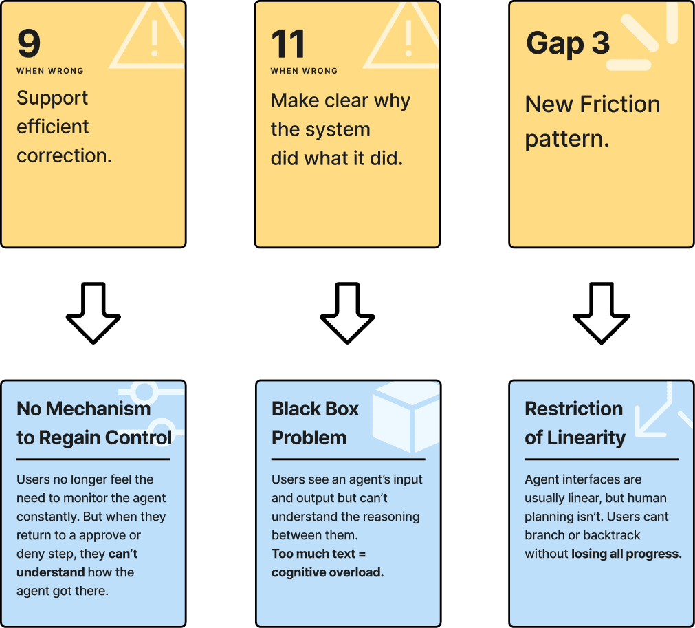 After further examination, Microsoft HAI guidelines G9 and G11 emerged as guidelines that revealed a critical gap when applied to existing systems. With the next wave of LLM agents, users can execute dozens of steps independently while walking away. These guidelines raise a gap for systems they were not designed for.